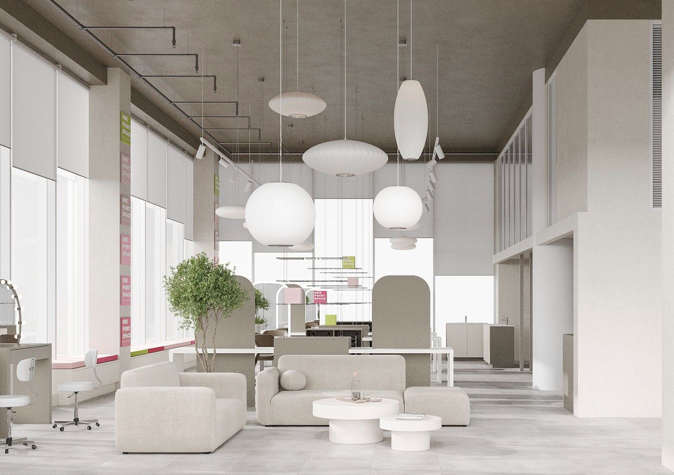Onepointspace is a collaborative beauty space that enables the specialists to realize their wildest creative ideas in hairstyle, makeup, manicure, and more.Located in the heart of Lisbon's fashionable Parque das Nações district the coworking covers an area of 350 sq.m. and features carefully thought luxury design, high ceilings, LED and bright natural lighting.The salon offers 23 workstations equipped with the most ergonomic furniture and the high-quality appliances.The space can also be arranged to host workshops, photoshoots, gatherings, parties and private events.
